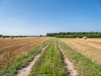 A lush cornfield with round bales of straw in the foreground stretches out as far as the eye can see under a clear blue sky in rural Germany.