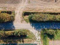 A top-down view of the Netherlands shows a rural landscape of asphalt roads, woodlands, and grass fields, with a lake of azure water surrounded by lush vegetation and a clear sky that tints and shades the land. Infrastructure, natural environment, and land lot properties are visible, with some incidental people in the thoroughfare and grass surface.