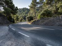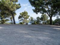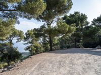 A top down view of the mixed surfaces of Mallorca, Spain, with its coastal ocean, parking lot, asphalt road, dirt, and gravel. A clear sky overlooks the elevated landscape of the Balearic Islands in Europe.
