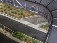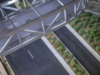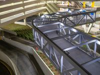 An aerial view of a parking deck in a residential suburb of Los Angeles, USA, illuminated by artificial light at night from a top down one quarter angle.