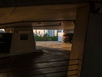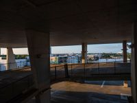 The break of day casts a hard shadow over the urban design of a parking deck in Miami Beach, USA. The aerial view from the elevated parking lot provides a top-down view of the cityscape.