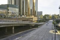 A modern road structure made of concrete, asphalt, and a bridge crossing an elevated highway entrance and exit in a metropolitan area, featuring a high-rise condominium, business district, and office building in the background.
