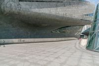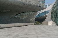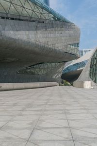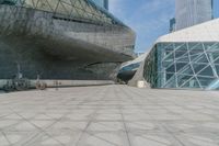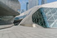 Aerial view of the skyline in Guangzhou, China, featuring modern architecture, grass surfaces, metal walls, glass walls, concrete surfaces, and open spaces framed by a clear sky with contrails. Taken from a high position looking straight down the road.