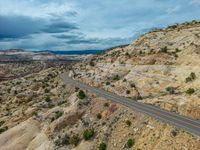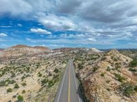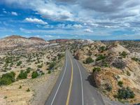 From a high position, the aerial view of Utah's landscape reveals a straight road cutting through the vast expanse. The asphalt road stretches into the distance, bordered by nature on both sides. The elevated perspective offers a unique glimpse of the cloud-filled sky and the beauty of the surroundings. This top-down view captures the serenity and grandeur of Utah's natural scenery, inviting travelers to embark on a journey along this high road.