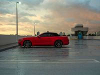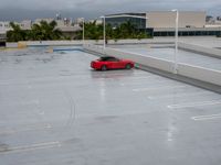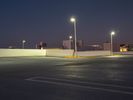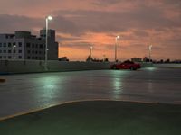 The break of day in Miami Beach, Florida, USA is seen from the top down of a parking deck, with street lights, a gloomy grey sky, and the open space of the parking lot and water below.