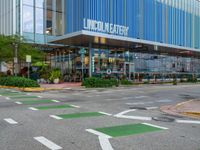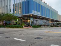 A top down view of the modern architecture, asphalt roads, and concrete street of Miami Beach, Florida. The city is alive with storefronts, restaurants, cafes, and shops, all dotted beneath a gloomy grey sky and the waters of the city.