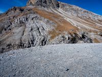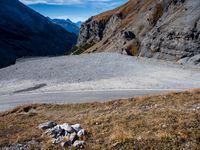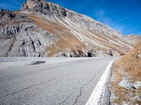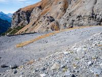 A winding road of asphalt, dirt, and gravel stretches over a mountain pass in Italy, Europe. Clouds hang low in the sky and contrails can be seen in the distance. An Armco barrier curves along the edge of the road, providing an overlook of the stunning landscape below.
