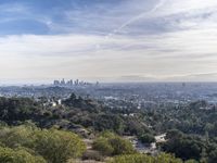 An aerial view of a highland cityscape with a river, road, and boardwalk at dawn, surrounded by mountain landforms, tree-covered hills, and open fields.