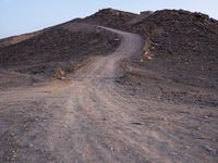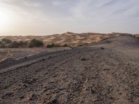 Aerial view of Marocco's ancient badlands, dotted with winding cliff lines, curving gravel roads, and towering sand dunes. The clear sky at dawn reveals a dynamic terrain of rock formations, rugged surfaces, and sand streets, all beneath the horizon of a vast erg, a landform of the Sahara Desert.