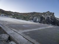 A scenic view of a road winding through mountains and tar surface in Portugal, Europe, at the break of day. The landscape is dotted with geological formations and a coastal boat ramp leading to the clear sky and horizon.