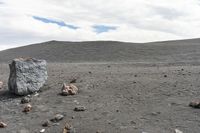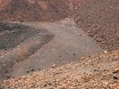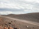Aerial view of a dirt road winding through a mountainous landscape of deciduous trees, grass, soil, and gravel. The sky is dotted with clouds and the atmosphere is filled with tints and shades of grey, brown, and rock formations.