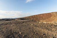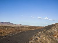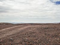 A dirt road is seen winding through a mountainous landscape, surrounded by trees and vegetation, with cumulus clouds in the horizon. The terrain is composed of rocky hills, slopes, and open plains, forming a unique mountain landform.
