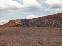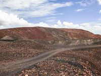 A winding road leading to a mountain range in the highlands is surrounded by a landscape of sand, dirt, gravel, and bedrock. Trees, grass, and open space dot the horizon while tints and shades of brown, gray, and green paint the scene. Cumulus clouds hang above the asphalt and wood road surface, leading to a plateau in the distance.