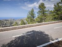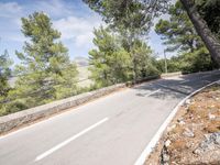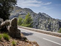 A winding road runs through a mountainous landscape in Spain, offering stunning views of the Balearic Islands in the distance. The ocean, wild vegetation, clear sky, and rocky walls provide an overview of the natural beauty of the region. Automobiles can be seen traveling along the asphalt highway, making their way through the mountain pass.