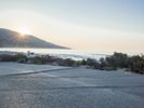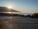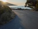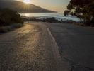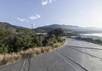 A rural road curves through lush vegetation and a stunning mountain landscape, leading to a clear, coastal ocean and beach with headlands and lochs, framed by a sky filled with contrails.
