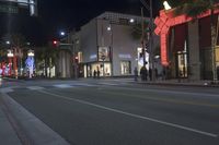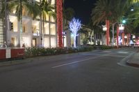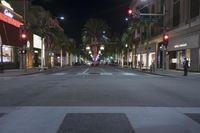 The city of Los Angeles, California, USA, at night illuminated by a mix of artificial light and neon signs, with classic architecture, public spaces, and streets lined with stores and palm trees. A pedestrian-friendly downtown area in this metropolitan hub of mixed-use infrastructure and human settlement.
