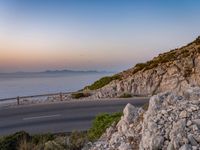 The sun breaks the horizon over an elevated asphalt road with an Armco guard rail barrier, winding around the Mallorca coastline of the Balearic Islands, Spain as a lighthouse stands in the distance.