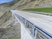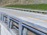 A line of cars is seen driving along the Pacific Coast Highway in Big Sur, California. The two lane highway is constructed of concrete and asphalt, surrounded by a guard rail, Armco barrier and Armco Barriers. The clear sky and coastal mountains provide a stunning backdrop to the thoroughfare.