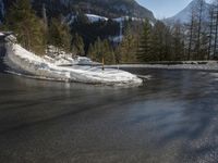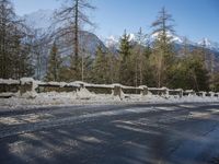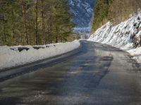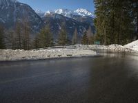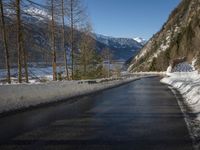A view of the winding road through Germany and Switzerland, with a reflection of the mountain range in the water. The Armco barrier gives a sense of safety as the asphalt leads down the frozen path and through the landscape of winter vegetation, wildernes, and geology.