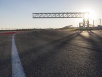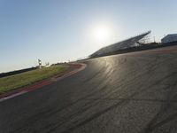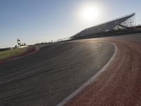 A long highway stretches across the plains as the sun rises in the horizon, with grandstands and infrastructure providing a fixed link between the soil and the race track. Automobiles can be seen speeding down the lanes and curves, racing against the sun and the clear sky visible above.