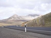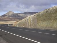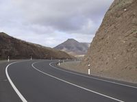 A view of the highway in Fuerteventura, Spain, winding through the rugged highland landscape of the island. The asphalt road is lined with yellow Armco barriers and is framed by the rocky outcrops, mountains, and hills of the area. The elevated road curves around the mountain pass, offering a scenic view of the natural beauty of Europe