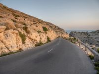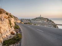 A coastal highway near Mallorca, on the Balearic Islands in Spain, runs straight down to the ocean with an elevated view of the natural landscape and a clear sky above the Armco barrier. A lighthouse stands in the distance.