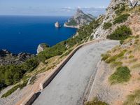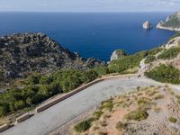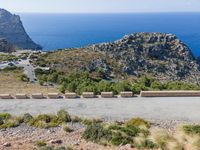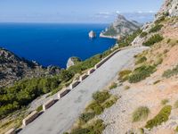Aerial view of a highway in Mallorca, Spain, part of the Balearic Islands in the Mediterranean Sea. The asphalt road is elevated and is surrounded by a Armco barrier. There is a clear sky and a stunning landscape of land and water can be seen.