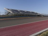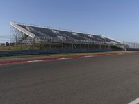 A long stretch of asphalt road with a bridge in the background is the perfect setting for a race in the countryside. The clear sky and grassy plain provide a perfect backdrop for the infrastructure and grandstands that make up the race track.