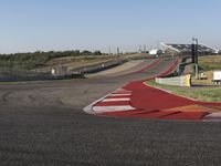 A car races along a winding road, with the clear sky and structures of the stadium in the background. This is an example of the infrastructure and transport networks that enable us to cover vast distances by road, air and fixed links.