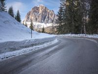 A stretch of highway in Europe is framed by an Armco barrier, the evergreen trees, and the snow-covered mountain landforms of the Alps in the background under a clear sky. The sun shines down on the now-frozen road surface, creating a winter wonderland of nature and transport infrastructure.