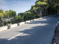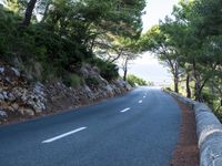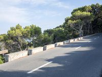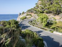 An elevated highway winding through the Balearic Islands in Europe, with an armco barrier, grass and trees on one side and a scenic ocean view on the other. A lake and mountain range in the distance and contrails from a plane in the clear sky above complete the picture.