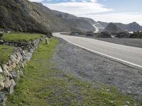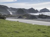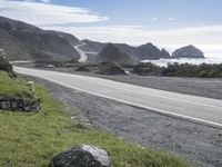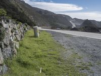A scenic landscape of mountainous terrain, open space, and a winding road surface along the Pacific Coast Highway in Big Sur, California, USA. The elevated highway is surrounded by coastal water, grassy hills, rocky cliffs, and mountain passes with a glacial fjord in the background.