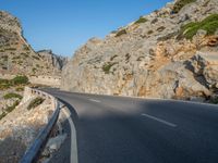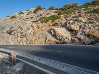 A road stretches through the beautiful landscape of Mallorca in the Balearic Islands, Spain. The clear sky casts a hard shadow along the asphalt, lined with an Armco barrier and guard rail for safety.
