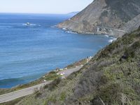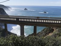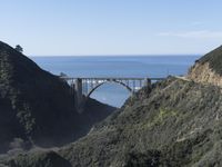 A scenic aerial view of the Big Sur coastline in California, USA. A winding concrete street, the Pacific Coast Highway, with its Armco barrier, bridge, and cliff formations, leads towards the blue ocean and shore. The clear sky adds to the beauty of this vacation destination, featuring rocky mountains, reservoirs, and lake views.