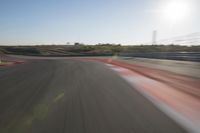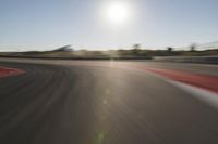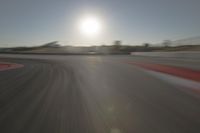 An aerial view of a winding road stretching out to the horizon, full of yellow and red racing vehicles, illuminated by the morning sun.