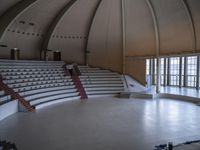 A classic architecture of a building in Berlin, Germany featuring a dome, a courtyard, an amphitheatre, an auditorium, a performing arts center, a theater, a concert hall, a wooden floor, a handrail, a window, a fence, a heater, an open space, a stair, a floor, a hall, a plaza, a room, a metal ceiling, a brickwork, a concrete, a tile, and a wooden flooring. It's a historic, iconic structure and the home of many sports and Olympic arenas.