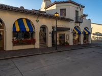 A charming tree-lined street with historic architecture and storefronts in the USA on a sunny day.