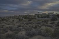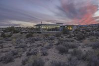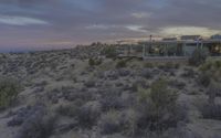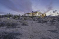 A dramatic view of a villa in the highlands of Yucca Valley, California, USA, in the chaparral biome of the open space recreation area. The mountain range and natural environment provide a rugged, dark, yet emotional atmosphere of the wild desert.