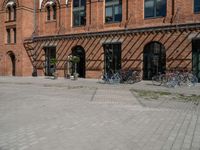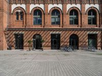 A classic brick wall of a Berlin factory in Germany's financial district is cast in hard shadow on a sunny day.