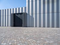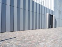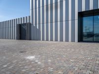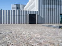 A modern building in the business district of Bremen, Germany, with a facade made of composite material, glass, concrete, wood, and tar. The cobble stone road, street light, and asphalt surface create a symmetrical pattern for the industrial infrastructure. It is dawn in the city, with clear skies and a variety of tints and shades.