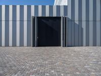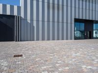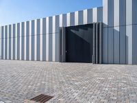 A modern composite material building with a facade of concrete, asphalt, cobble stone, wood and other materials, located in the business district of Bremen, Germany. The combination of lines, rectangles, shades and tints create a unique pattern in the clear sky of dawn.