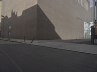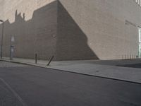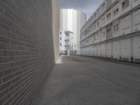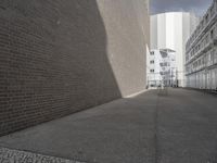 A snapshot of Berlin, Germany showcasing its urban infrastructure. The scene consists of a beige brick wall, a black asphalt road surface, and a white tree lined alley-way with a modern industrial building in the background. The hard shadows and monochrome color palette give the scene a timeless quality.