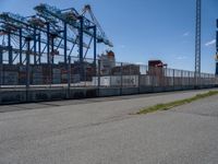 A view of the rolling stock, asphalt road surface, overhead power lines, and other industrial infrastructure of Bremerhafen, Germany, on a clear day. The landscape is populated with chain-link fencing, public utility poles, street lights, transmission towers, and trees, with a container port and factory in the background.
