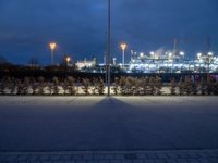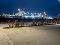 An industrial parking lot surrounded by factories in Berlin, Germany lit up by neon lights at night.