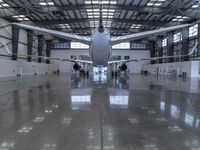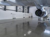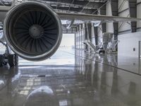 A jet parked in an airplane hangar reflects off of the concrete surface of the loading dock, creating a modern industrial architecture with an open space interior in a busy airport.