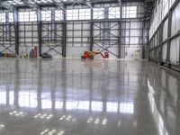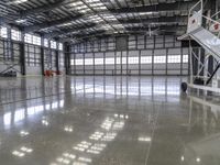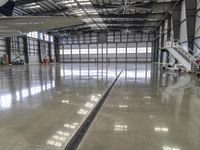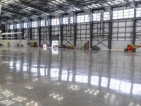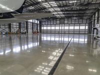 A private jet is reflected in the concrete surface of an airport hangar, with modern architecture and open space in the background of this industrial loading dock on a bright day.