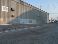 A storage depot, warehouse, and factory at the break of day in Salt Lake City, USA, with a dirt surface, vegetation, and hard shadows in the gravel area.
