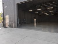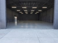 Interior view of a spacious industrial warehouse in Los Angeles, California, USA with concrete flooring and metal ceiling.