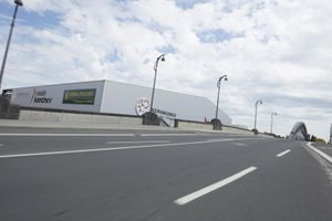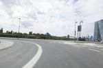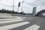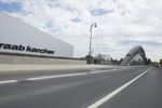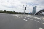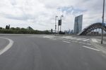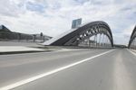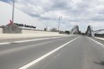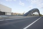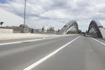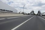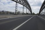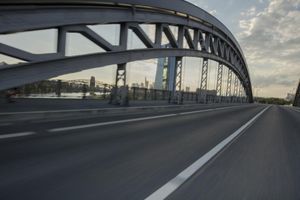 A metropolitan area on the move, Frankfurt, Germany is a modern city with intricate infrastructure that includes bridges, roads, and highways. This day shot shows an automobile passing over an extradosed bridge, with motion blur and cables of the cable-stayed bridge in the background, against a backdrop of clouds.