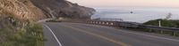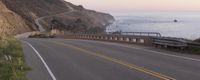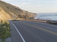 The sun rises over the California coastline, illuminating the winding Pacific Coast Highway and the rolling terrain of the Big Sur. The two-lane road stretches out below with the sea, cliffs, and trees in the background, while the Armco barrier, guard rail, and concrete bridge serve as infrastructure against the clear sky and highland clouds on the horizon.